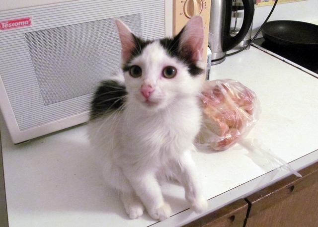 Největší boje o žrádlo jsou ale při snídani. Nepravidelně všem zvířatům dopřáváme maso a vnitřnosti. Máme kousek od domu výdejnu masa pro psy a jsme velkými odběrateli. Největší obliba je u nás v kuřecím mase a srdíčkách. Já jim radši dávám hovězí kostky. Abych tak ale řekla, tak co se vezme psovi a odřeže se, to kočky sežerou. Tedy kromě Sazinky, ta statečně pohrdá telecím, nelibovým hovězím a uznává jen maso libové a vnitřnosti naporcované. Inu, prostě jako malá spadla na hlavu a toto je beztak důsledek.