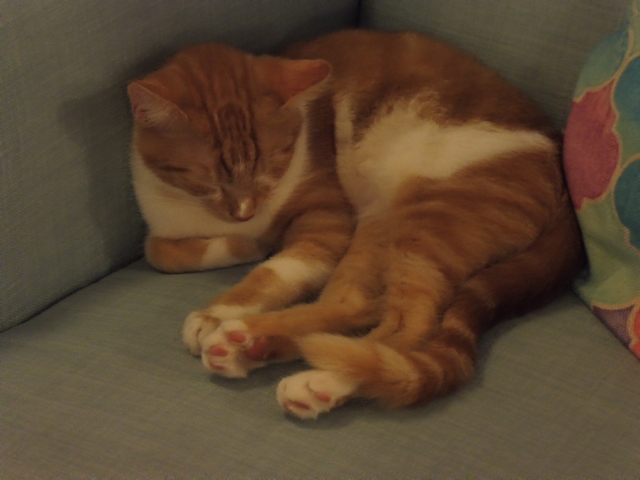 Hrnuly jsme se rovnou k rezervovaným místům, ale zjistily jsme, že jedno z nich - bledě zelené vysoké křeslo je totálně obsazené a dotyčný nevypadal, že by místo hodlal uvolnit. Byl totiž stočený do klubíčka a tvrdě spal. Tak jsme si přitáhly jinou židli.