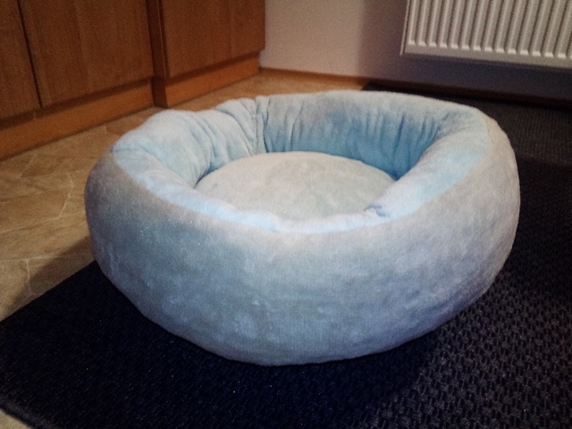 Vystříhneme látku 2krát, záclona (ve videu) nemusí být, pelíšek drží tvar i bez ní. Jako materiál jsem použila deky, ale nejsou moc pevné, už máme jeden pelíšek zašívaný :-(