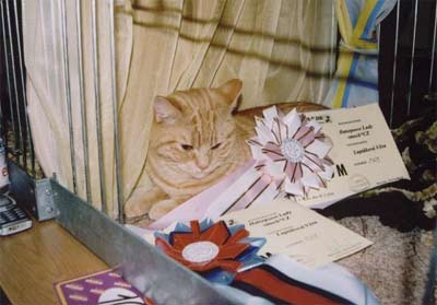 Ale v neděli to už bylo lepší. Protože jsem se v sobotu zase tak „vyznamenal“, tak mě na druhý den omluvili ze soutěže a já si pěkně celý den ležel a předváděl se. Dokonce jsem ani nikoho nepoškrabal ani nepokousal, vždyť mi už o nic nešlo. Soutěžila jen Hanka, dostala druhý CAC a pan posuzovatel Eric Reijers jí zase chválil, měl radost, že je na výstavě nějaká červená kočička a říkal, že je dobře živená. Ona nás při jídle maminka pořád hlídá, protože já Haně kradu. Mám nejraději rosolovou šťávičku a na ní potom zůstanou suché kousky, tak to se prý nesmí, tak mami hlídkuje.