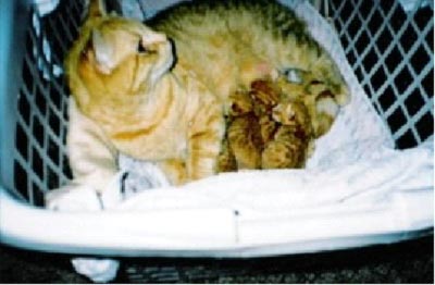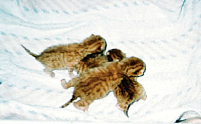 Hanička se totiž ještě celý týden o svoje miminka v bříšku vzorně starala, chodila na procházky, chytala mouchy, vyhřívala se na sluníčku, pěkně baštila a z neděle na pondělí po půlnoci, když venku začala pořádná bouřka, skočila si do postele k mamince, potom k tátovi, všechny zkontrolovala a potom pod postelí porodila čtyři miminka. Pravda, že při tom nebyla sama. Knikot prvního miminka naší pozornou mámu vzbudil a potom už s Hankou ležela u postele a dávala pozor. Hanička to ale zvládla, miminka pěkně přivítala na světě, olízala a osušila je, všechno spolehlivě obstarala a ráno je všechny maminka uložila do připraveného košíka. To už miminka měla za sebou první krmení. A od toho pondělka už nic jiného nedělají. Jen se krmí a spí. Už jsem se na ně byl několikrát podívat. Jednou jsem stál na okraji košíka a jednou jsem si dokonce vylezl na skříň a hlídal z výšky. Co kdyby k nám zase vniknul ten strašný cizí doktor?!