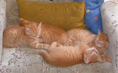 Všechny naše kamarády moc zdravím a omlouvám se, že mám skluz, ale to víte, u nás doma je pořád spousta dění a maminka nestíhá. Prý teď, až bude venku brzy tma, bude víc času. Ale tomu moc nevěřím, protože jí všechen čas kradou ty naše koťata. To je s nimi práce. To bych byl nevěřil. Tak především pořád jedí. Po ránu, tak kolem půl páté se probudí a vyrazí šmejdit. Maminka jim musí jít dát konzervičku, někdy si po ránu dají smetánka, ale někdy mi ujídají mojí šunku. To jsem to dopracoval, dávají jim moje oblíbené jídlo. A tím právě rostou jako z vody. Mají už každý minimálně 1 kg, dohromady váží jako jejich mamka Hanka. No na mě nemají, já mám 8,5. Potom, když se nabaští, dělají všelijaká alotria. Skáčou překážky, hrají si v košíku, koušou do hraček i do sebe, někdy si dokonce dovolí a napadnou ze zálohy i mě. Ale já jim to toleruji, musí se přeci učit. Když mě to ale bolí, tak je trošku zperu, aby si nemysleli, že život je peříčko. Často a dlouho spí, tak jako správné kočičky, lehávají na okně, což je naše oblíbené místo, a neprobudí je ani, když maminka vysává smetí z podlahy. Jsou celí po mě. Říkala to i naše kamarádka Alenka z Prahy, která se na nás přijela podívat. Moje děti se jí líbily, ale největší radost měla ze mě, protože jsem její „vnouček“ a je na mě náležitě pyšná.