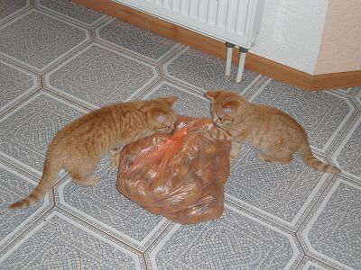 S koťaty už je docela zábava. Vůbec se mě nebojí, dokonce si na mě i dovolují. Já to toleruju, jsou to přeci moje děti. Holky ze zadu očichám, potom je kousnu do krku, aby věděly, že já jsem ten hlavní. Napoleona někdy i peru, ale jen tak něžně. Třeba se koušeme do krku. Tedy on se snaží, ale moje chlupy tedy sotva prokousne. A nebo mě společně chytají za ocas, někdy i za tlapky. Ne, že by mě to právě bavilo, ale chvíli tu hru vydržím. Taky se potkáváme u misky s jídlem. Je to docela fajn, protože můžu zase baštit kotěcí granulky. Mami tedy nadává, že budu špekoun, ale já to vyběhám. A ty jejich hry! Tak třeba moc je baví hra s igelitem, s pískací myší na provázku, s košíčkem na houby, a je to několik dní zpět, co objevila hru v květináči. Tu jim ale mami rychle zatrhla. Nancyna je mrňous a dokáže šplhat po závěsu, visí na něm a potom na ostatní vybafává. Jo a taky prima je hra s toaletním papírem. Dneska ráno byl rozmotaný úplně celý. A přesně po mně zdědila hru v kredenci. To se vleze do kredence, když se nikdo nedívá, dvířka se zavřou, no a potom se tam lomozí s kastroly a poklicemi. A potom ještě hra na schovávanou někde. To jsou přeborníci. Nejraději se schovávají ve skříni, v botníku a pár dní stará novinka - ve špajzce. No a to znám z vlastní zkušenosti, tam se potom zhasne, jeden se tam bojí a křičí a křičí, až ho mami najde a všichni se radují.