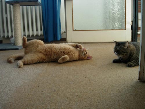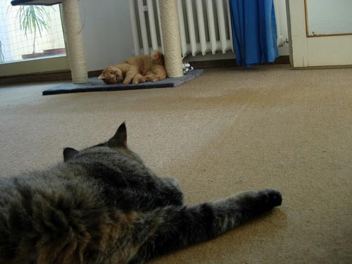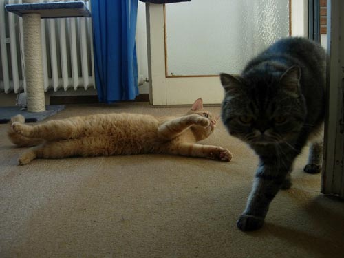 Nemohu napsat, že bych se Aliho přestal bát úplně. Ale už jsem před ním tolik neutíkal a dokonce jsme občas seděli i vedle sebe. Asi by z nás ti kámoši nakonec byli. Začali jsme lítat po bytě, trénovali jsme sprint na kočičí olympiádu a v noci jsme dbali na to, aby Terka nezaspala. (Pravidelná kontrola budíku po 30 minutách je myslím dostačující.) Najednou jsem měl k dispozici celý byt i s koupelnou a dokonce jsem si mohl vlézt i za ručníky (jako doma). Proměnil jsem se v nenažraného kocoura a baštil jsem to, co bylo v mé misce, to, co bylo v misce Aliho, loudil jsem u Terezky a kradl jsem Alimu i vitamíny. Tak takový jsem byl. Promiň Ali.