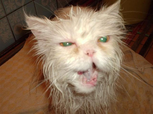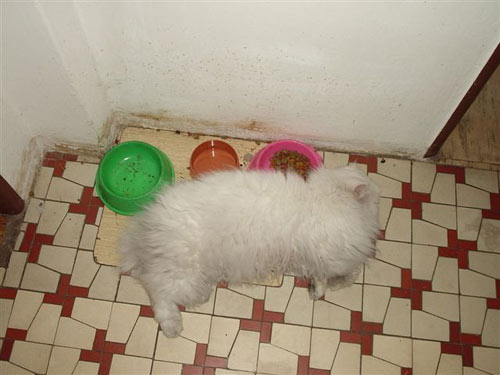 Jeho původní barva je bílá, ale tu si občas změní. Rád totiž lehává ve sklepě na uhlí, to v zimě. V létě se zase povaluje v zelené trávě nebo pod višní, na spadaných plodech. A tak bývá velmi často maskovaný.