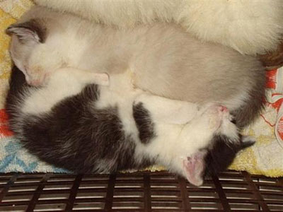 Jsou to opravdu mrňousové. Ještě minulý týden sotva chodili. Pletou si tlapičky a když se chce jeden podrbat, obvykle se překulí na záda. Pít dostávali kočičí mlíčko v předehřáté stříkačce. Jsou to asi bráškové. Pan doktor říkal, že to vypadá na kluky, ale oni se pořádně prohlídnout nenechali. Jsou zdraví, dokonce nemají ani žádné parazity. K nám si s sebou donesli samé dobrůtky, které jim jejich „páníci“ nakoupili.