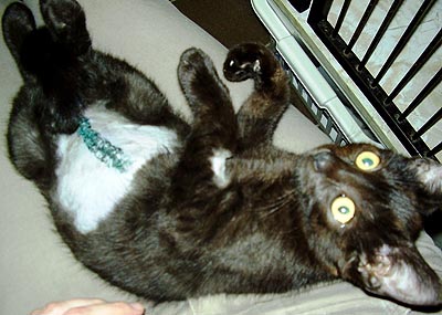 Kocourek měl velkou kýlu - břišní stěnu neměl vůbec vyvinutou, střeva mu držela pohromadě jen pobřišnice a kůže.