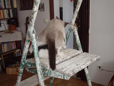 Zvířata jsou nakrmena, tak mohu nakrmit nás, lidi. Tedy, spíš ráda bych nás nakrmila. Jenže kočičáři skočí na stůl a asistují při přípravě. Moje sušenky je ani tak nezajímají, ale ten sáček je prima. Tak nedají pokoj dokud za a) neskončí v koupelně a my se můžeme najíst v klidu, za b) nekončí v koupelně, ale my se při jídle neustále oháníme a otáčíme hlavy se stravou na různé strany (alespoň nějaká rozcvička), za c) koťata nekončí v koupelně, my se netočíme, ale snídáme ve stoje a opakovaně sklepáváme Vetřelce z nohavic. Možnost, že bychom se zavřeli do koupelny my a tam se v klidu najedli, jsme zatím zavrhli. Po jídle se jakž takž stačím počlověčit. Nemusím se líčit, jsem vyzdobena kočičími drápy, ale zase se můžu pustit do úklidu. Není možné mít dřez neustále suchý, to nějak nejde. Koťata kontrolují, co se v dřezu nachází, a mokré tlapičky jsou zase na stole, pod stolem, na lince, na plotně... Připadám si jako perpetuum mobile (nebo debile?). Vyčerpaně klesnu do křesla, ale koťata s tak malým bříškem jsou tak plna energie, že okamžitě sloužím jako škrabadlo, odrazová rampa, nebo se snaží ukousnout mi náušnice, případně utrhnout řetízek. To v lepším případě. V tom horším případě okusují mne. Tak je v Maxíkově veselo. Vetřelci provádějí nálety. Při honičkách vyskočí až do poloviny dveří a zaseknou se do koženky. Stávají se horolezci na sedačkách i na křesle. Okupují i okusují květiny. Člověk by jim tu energii mohl závidět. Občas jich mám opravdu plné zuby a Maxíka už třetí den vidím jen ve skříni.