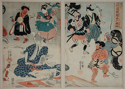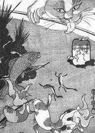 Příběhů o zlaté rybce japonského umělce Kuniyoshi Kitagawy, velkého milovníka koček, který jim věnoval místo v mnoha svých dílech, zobrazuje skutečný vztah kočky k rybě.