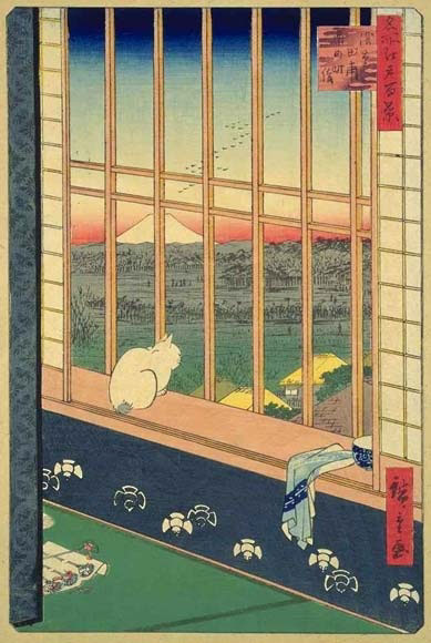 Edo je starý název Tokia z období šogunátu od počátku 17. až do konce století 19. století. Obraz Kočka na okně je součástí rozsáhlé řady Hiroshige Utagawa (Ando) a jeho